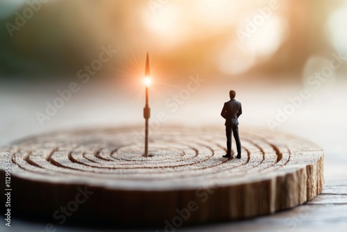 Businessman stands on wooden surface contemplating direction toward glowing compass