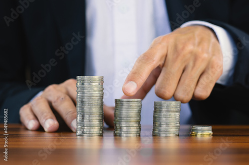 Businessman touch on coins stack on wooden table , Man stacking coins for saving money retirement ,Men coins stack for investment