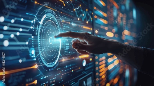 Businessman touch screen on media screen graphic. System of technological processes