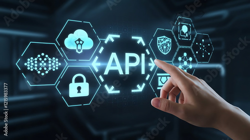 businessman touched API acronym word icon on virtual screen on background of tech devices. Man presses button on touch screen interface and select "API". Business, Internet and technology concept.