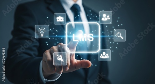 Businessman touches LMS learning management system interface with icons education online learning