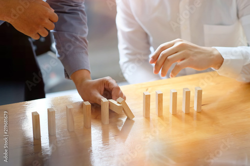 Businessman two colleagues hand stopping the domino effect. risk control concept.