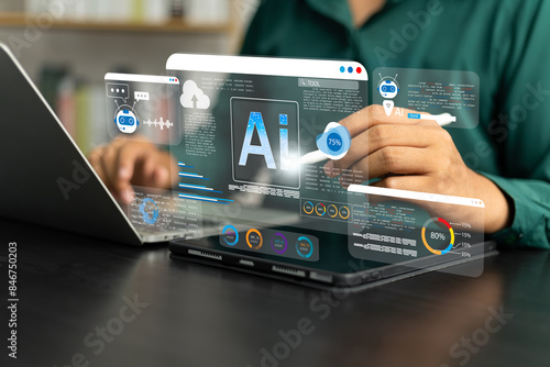 Businessman use artificial intelligence AI technology for enhanced work efficiency data analysis and efficient tools, Unlocking work potential with AI solutions chatbot help solve work problems.