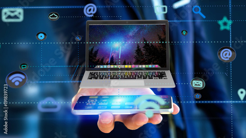 Businessman using a smartphone with a Computer surrounding by app and social icon - 3d render