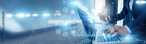 Businessman using laptop and business targeting analyzing technological data, market segmentation, customer profiling, lead scoring, behavioral analytics, digital marketing strategies