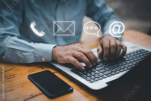 Businessman using Smart Phone with the email, call phone, address, Chat message icons.Customer support hotline Contact us people connection.