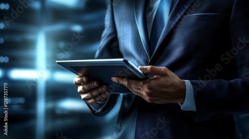 Businessman using tablet computer in modern server room with futuristic data network and digital cloud computing concept, showcasing advanced technology, cybersecurity, and high-tech business innovati