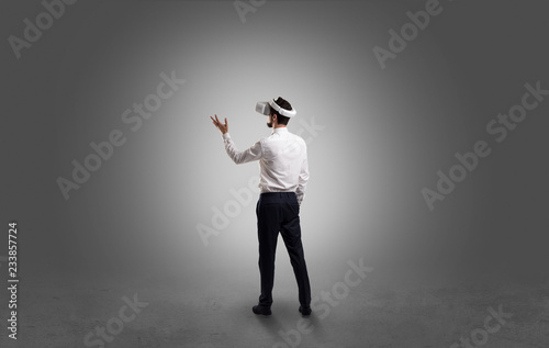 Businessman wearing vj glasse in an empty room with no wallpaper