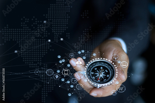 Businessman with a compass holding in hand. Define marketing direction and search customer global network
