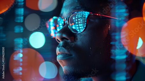 Businessman with glasses is looking at digital data and code on the screen, with blue light effects and a digital background