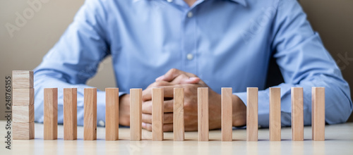 Businessman with wooden Blocks or Dominoes. Business, Risk Management, Solution, Insurance and strategy Concepts