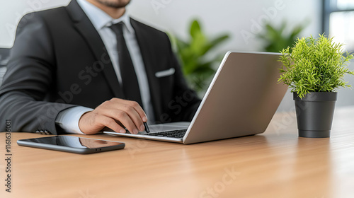 Businessman Working on Laptop at Desk, Efficiently Managing Tasks and Projects with Digital Tools, Improving Productivity Strategically.