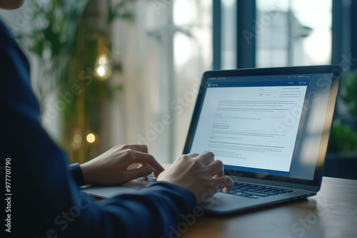 Businessman working on laptop computer with big screen for remote work from home office