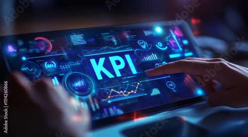 Businessman's Hand Reaching Towards KPI Display and Performance Icons. Precision in Market Data Analysis for Business Planning.