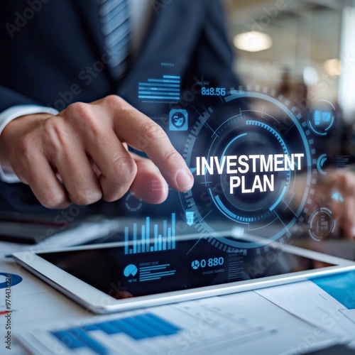 Businessman's hand touching tablet screen with investment plan with digital system and technology.