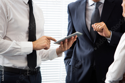 businesspeople talking and using a digital tablet
