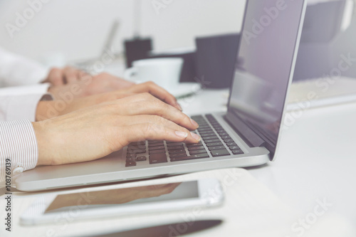 Businesspeople using laptop side