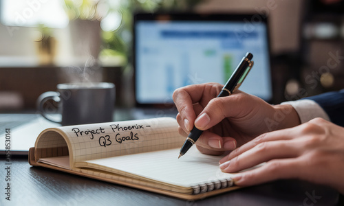 Businessperson planning Q3 goals, writing notes in a notebook at a desk with a laptop and coffee.