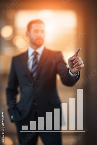 Businessperson pointing at an upward-trending growth chart in a futuristic setting.