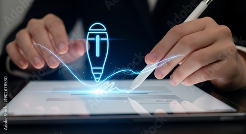 Businessperson using digital tablet with glowing lightbulb idea