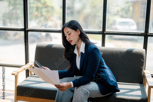 Businesswoman comparing data from smartphone and documents sitting on sofa