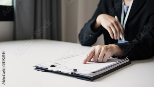 Businesswoman employer sitting holding new employee's documents to evaluate and review new employee's personal history. Recruitment concept, job placement