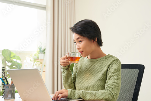 Businesswoman having a cup of coffee while using her laptop