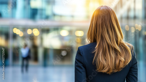 businesswoman in a suit stands with her back to the viewer, symbolizing ambition, professionalism, and leadership. Her confident stance conveys focus, determination, and the pursuit of success