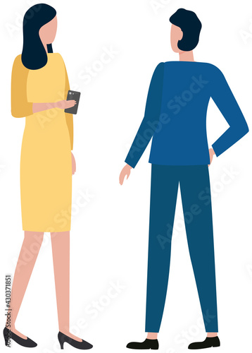 Businesswoman in yellow dress with phone in her hands stands and talking with colleague. Man in blue suit discussing work problems with woman. People communicating together isolated on white
