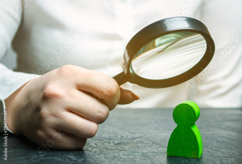 Businesswoman is holding a magnifying glass over a green man figure. Search for a talented employee. Identifying strengths in the company. Disclosure skills. Employee characteristics