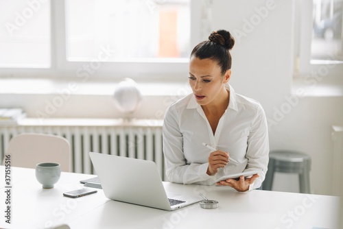 Businesswoman using digital tablet and laptop on desk in home office