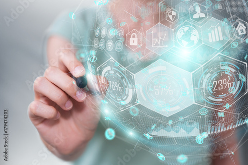 Businesswoman using holograms datas digital sphere with a pen 3D rendering