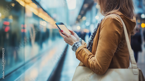 Businesswoman using smartphone in the city blur background