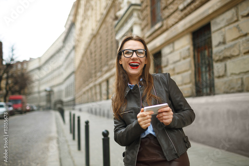 Businesswoman walking down the street while talking on smart pho