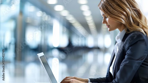 Businesswoman working on laptop in modern office building hallway.