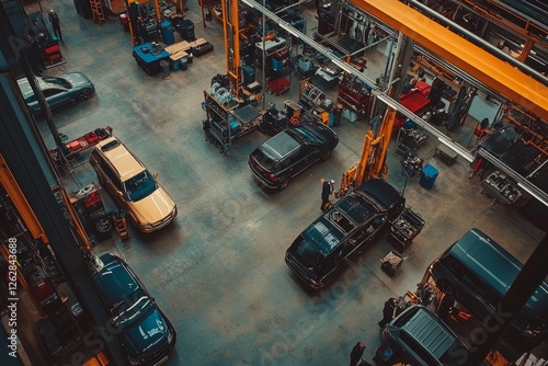 Busy Automotive Garage with Mechanics at Work from a High Angle
