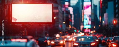 Busy city street at dusk with illuminated blank billboard, traffic, and vibrant lights, creating an urban, energetic atmosphere.