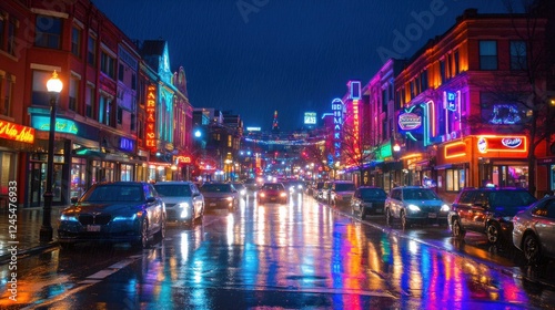 Busy Dutch Business District Street at Night with Neon Lights Reflecting off Wet Pavement Captured in a Stunning Fujif 2-Gigapixel Shot