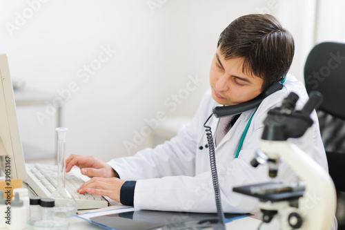 Busy medical speaking phone and working on pc