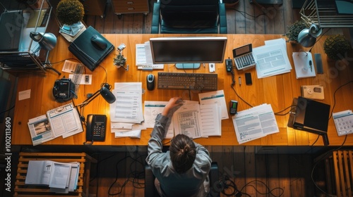 Busy Office Workspace with Papers and Technology