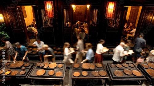 Busy restaurant patio with plates and people under warm light in a vintage building