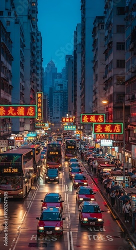 Busy urban streetscape bustles with traffic and illuminated signage during twilight hours