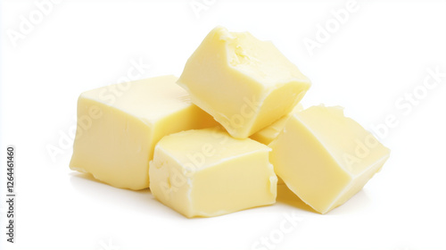Butter Cubes: Close-up of four pale yellow butter cubes, freshly cut and gleaming, ready for cooking or baking.