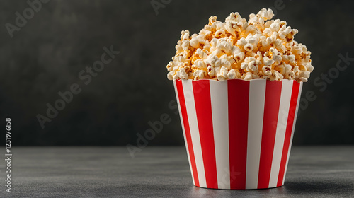 Buttery popcorn in striped bucket on dark background; movie night snack