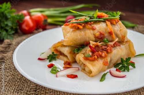 Cabbage rolls in tomato sauce. Wooden background. Close-up
