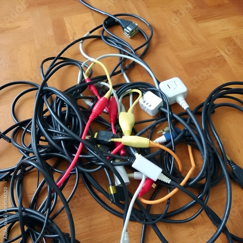 Cable chaos clutter from multiple electric wire extension cords and multi-contact plugs on wooden floor. Tangled cables on the parquet floor.