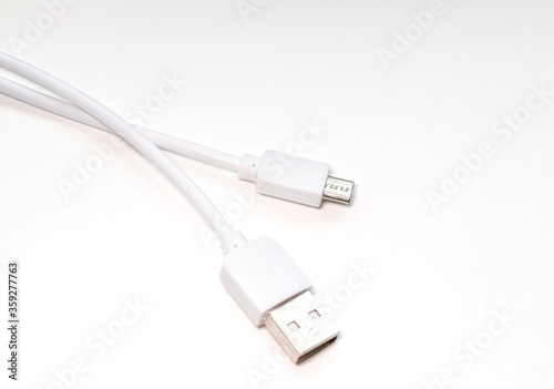 Cable for charging a mobile smartphone on a white background. selective focus