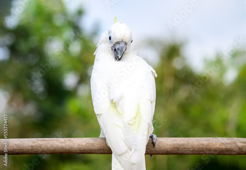 Cacatua galerita - Sulphur-crested Cockatoo sitting on the branch in Australia Big white and yellow cockatoo with green background.