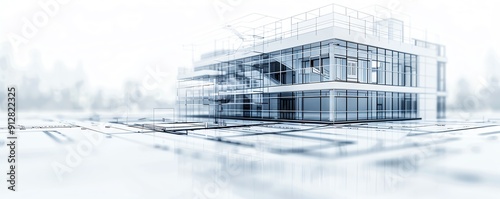CAD software interface displaying a 3D model of an architectural building, detailed blueprint Precise and innovative, efficient and essential, modern architecture