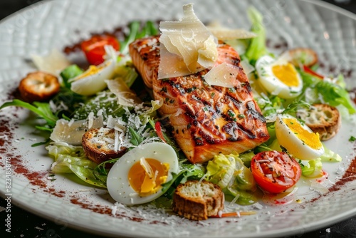 Caesar Salad with Grilled Salmon, Red Fish Fillet Salat, Quail Egg, Mini Baguette Crackers